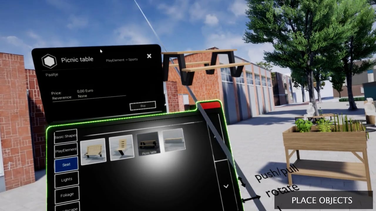 Het gevoel van immersie maakt VR tot een heel krachtig gereedschap in het ruimtelijk ontwerpproces. Mensen kunnen hun eigen plein ontwerpen in VR, met de hulp van een “toolbox” gevuld door ontwerpers. Virtueel staand op het plein ervaren ze direct de gevolgen van hun keuzen. Ze kunnen dit alleen doen, of met meerdere mensen tegelijk.